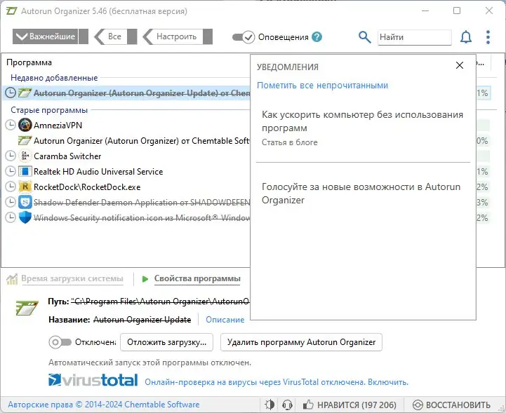 Программа Autorun Organizer предназначена для управления автозагрузкой в операционной системе Windows, обеспечивая быстрый доступ к списку приложений, запускающихся при старте системы. Инструмент позволяет отключать, удалять и откладывать запуск программ, а также проверять их на наличие вредоносного кода через онлайн-сервис VirusTotal. Утилита подходит как для новичков, так и для опытных пользователей, стремящихся оптимизировать производительность компьютера.