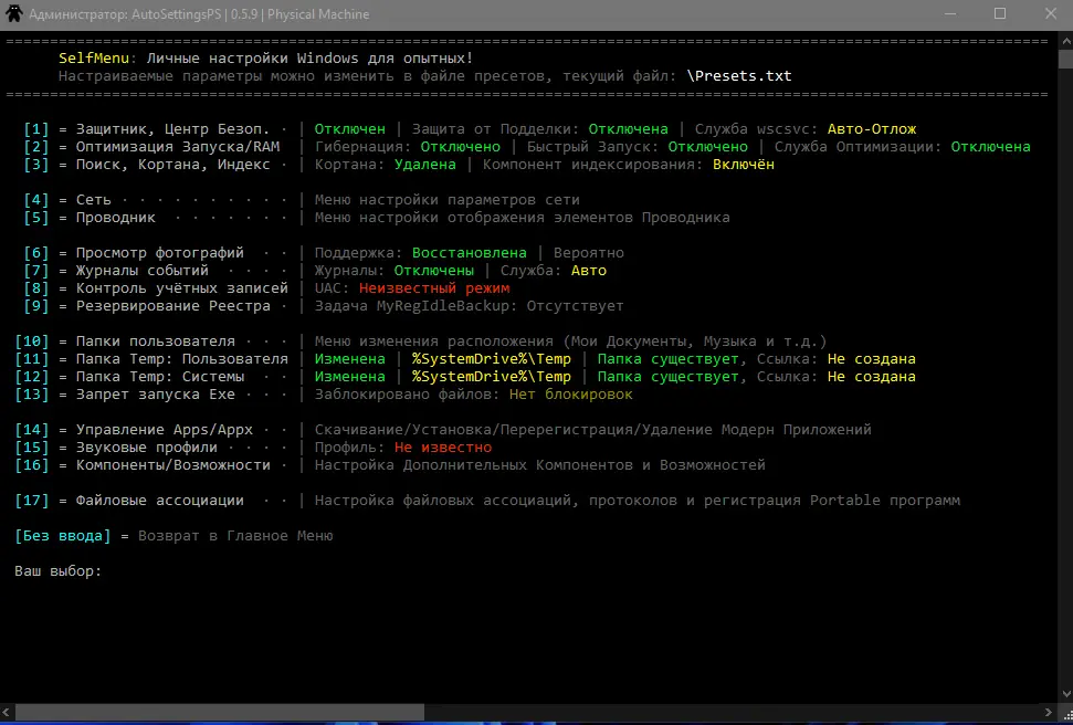 AutoSettingsPS представляет собой современный твикер, разработанный с нуля на PowerShell 5, обеспечивающий глубокую настройку операционной системы через простой интерфейс. В отличие от предыдущей версии на основе batch-скриптов, новая реализация предлагает улучшенные алгоритмы, расширенные возможности и более точный контроль над системными параметрами. Инструмент работает автономно, не требует установки и может запускаться с любого носителя.