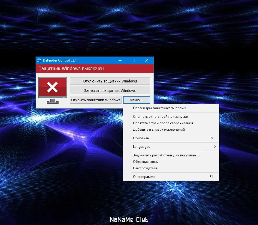 - Позволяет отключать защитника без вмешательства в реестр вручную
