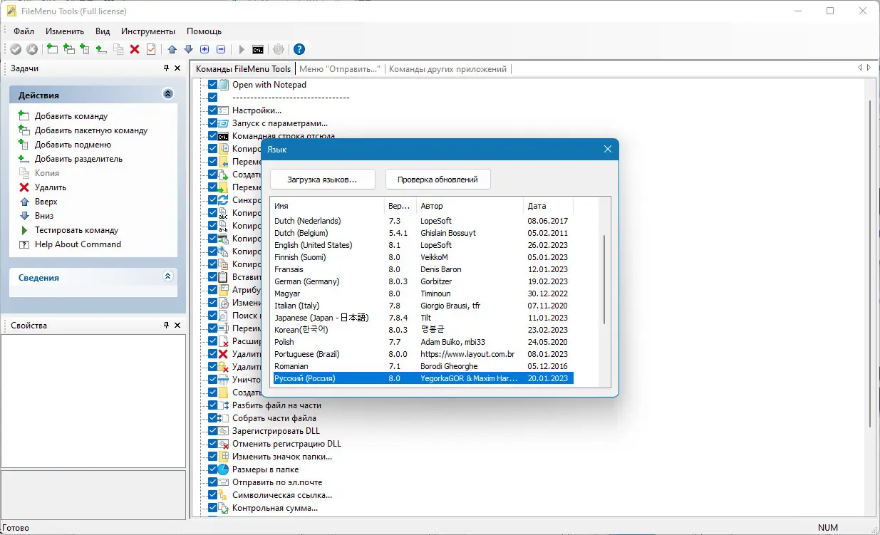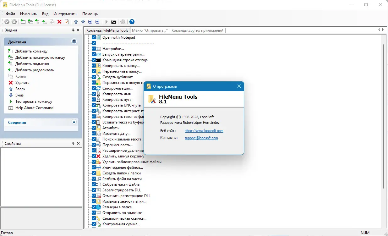 После запуска FileMenu Tools открывается интуитивно понятное окно с древовидной структурой элементов контекстного меню. Пользователь может выбрать тип объекта — файл, папка, фон рабочего стола — и настроить команды, которые будут отображаться при клике правой кнопкой мыши. Добавление новых пунктов осуществляется через мастер команд, где можно указать исполняемый файл, параметры запуска, значок, горячую клавишу и условия отображения. Также доступна возможность редактировать порядок элементов, создавать разделители и вложенные подменю. Для быстрого доступа к часто используемым инструментам предусмотрены предопределённые команды, такие как копирование пути, удаление без корзины, регистрация DLL-файлов. Работа с утилитами вроде разбиения файлов или расчёта контрольных сумм не требует дополнительных знаний — всё реализовано через простой интерфейс.