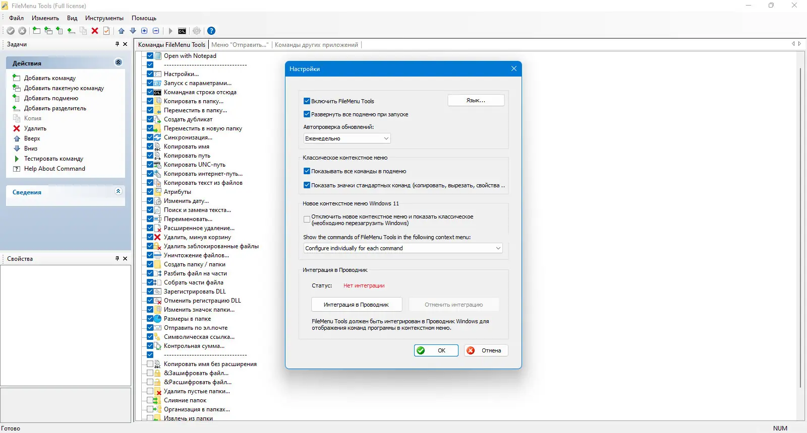 - Пользователь может добавлять собственные команды, указывая исполняемые файлы, параметры запуска и условия отображения в меню.