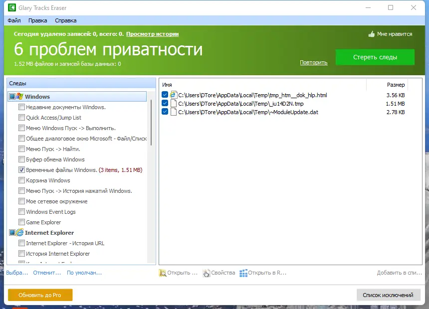 Использование Glary Tracks Eraser не требует специальных знаний. После запуска приложения пользователь видит список категорий, в которых можно удалить следы активности. Достаточно отметить нужные пункты, нажать кнопку «Анализ», чтобы программа проверила наличие данных, а затем подтвердить удаление с помощью кнопки «Стереть следы». Процесс происходит быстро и не требует вмешательства в настройки системы. Для очистки данных конкретного браузера или приложения достаточно выбрать соответствующий плагин в списке и повторить те же шаги. Поддержка множества браузеров и приложений делает утилиту универсальной, а возможность настройки очистки по категориям позволяет гибко управлять процессом.