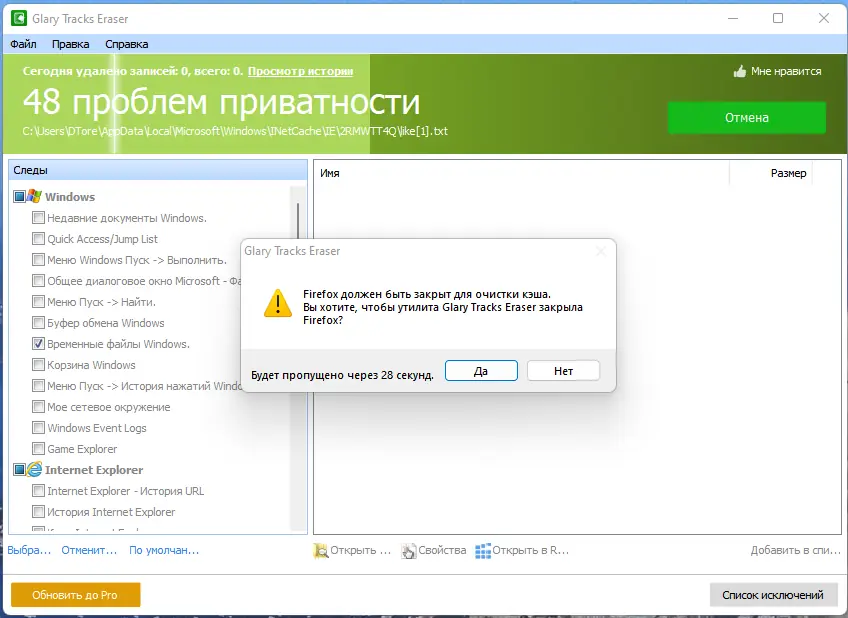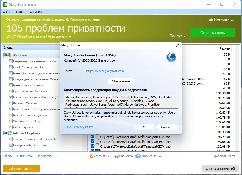 Glary Tracks Eraser — это инструмент для очистки личных данных с компьютера, удаляющий следы активности в системе, браузерах и приложениях. Программа помогает защитить конфиденциальность, стирая историю, кеш, куки, временные файлы и другие данные, которые могут быть использованы для отслеживания действий пользователя.