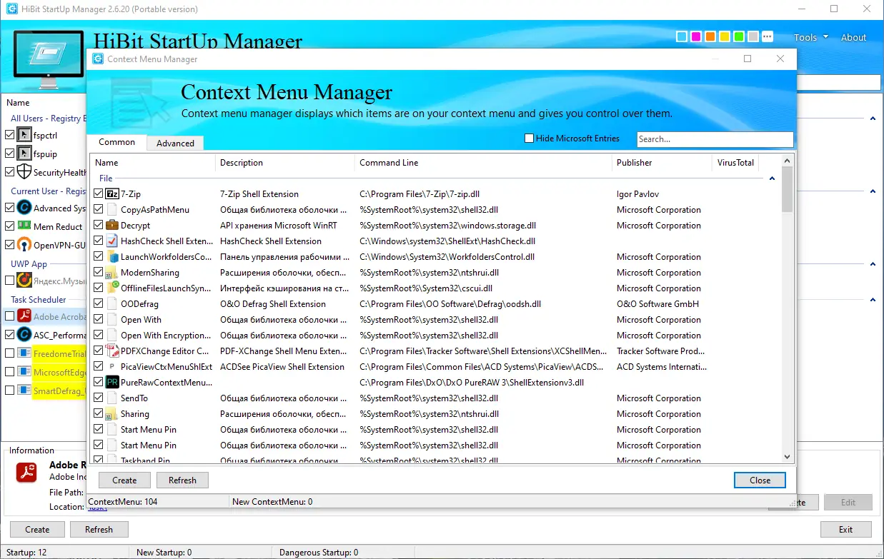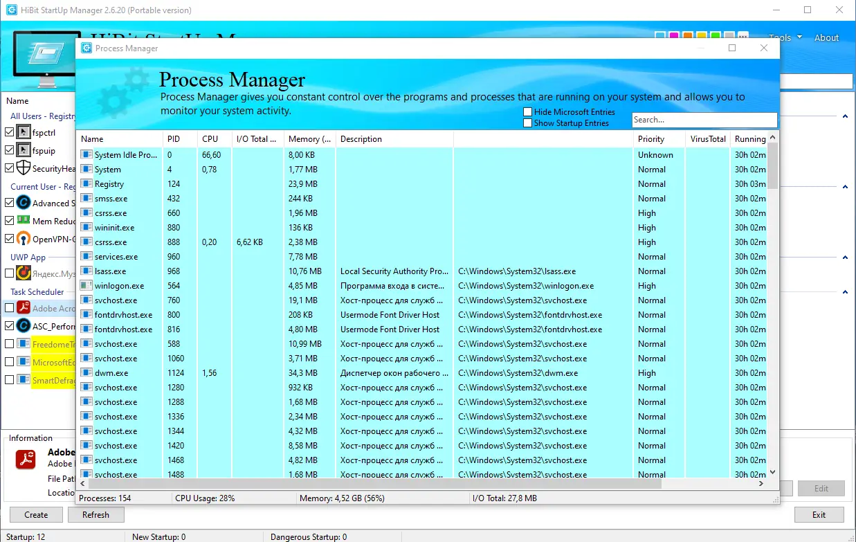 HiBit Startup Manager предназначен для тонкой настройки автозагрузки в операционной системе Windows. Программа даёт полный обзор всех приложений, служб и задач, которые активируются при включении компьютера, и предоставляет инструменты для их эффективного управления. Это позволяет не только ускорить запуск системы, но и исключить нежелательные или потенциально опасные элементы.