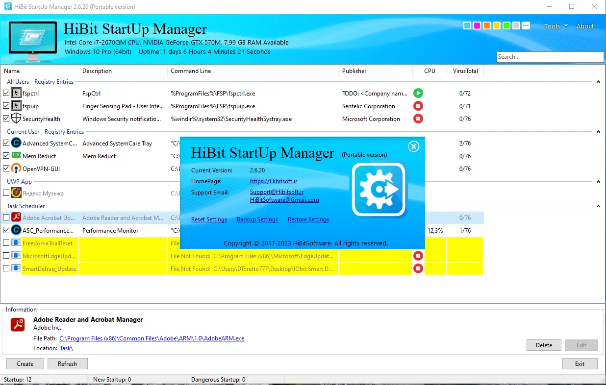 HiBit Startup Manager — это утилита для управления автозагрузкой в Windows, позволяющая контролировать программы, запускаемые при старте системы. Инструмент помогает ускорить загрузку компьютера, повысить безопасность и оптимизировать работу операционной системы за счёт точного контроля над стартовыми процессами.