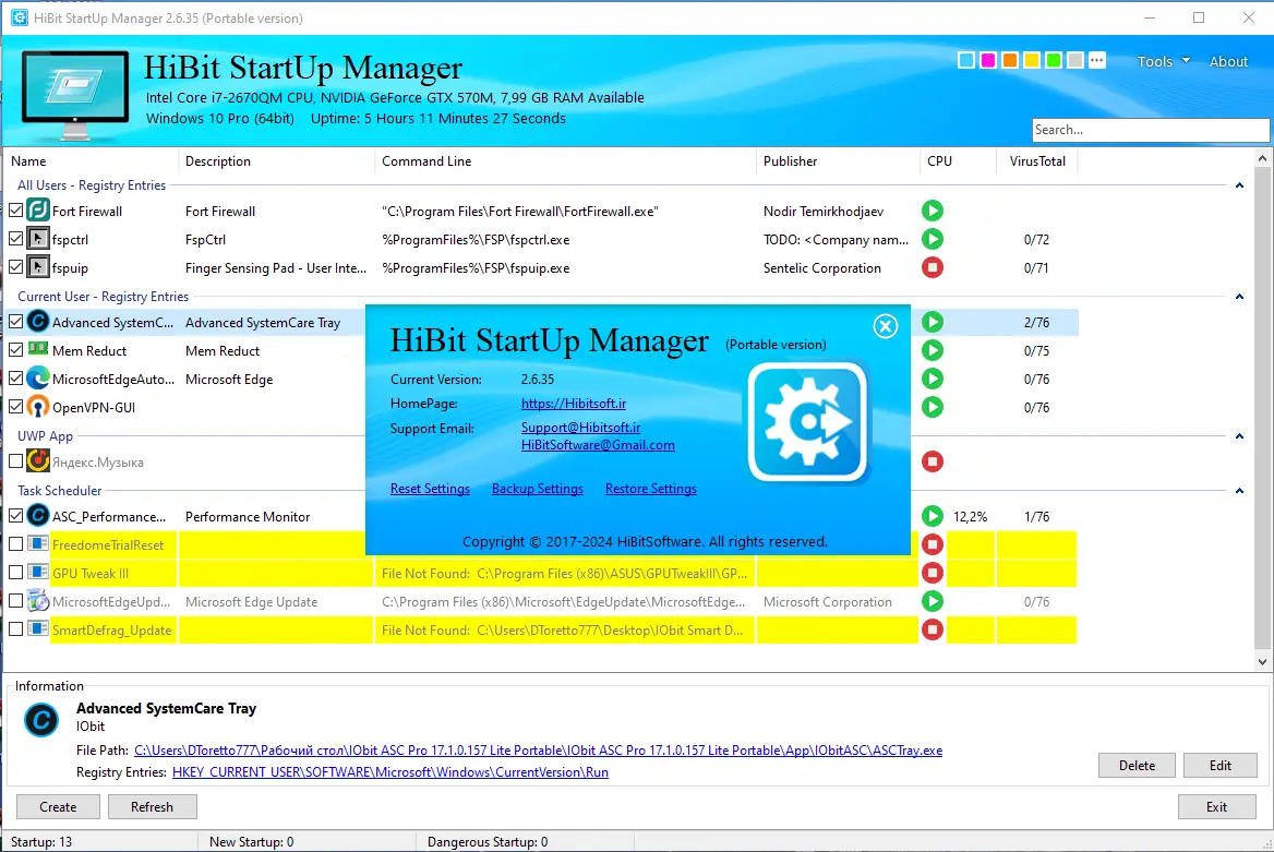 HiBit Startup Manager — инструмент для управления автозагрузкой в Windows, позволяющий оптимизировать запуск системы за счёт контроля над программами, службами и задачами, запускаемыми при старте. Программа помогает ускорить загрузку, повысить безопасность и стабильность работы операционной системы.