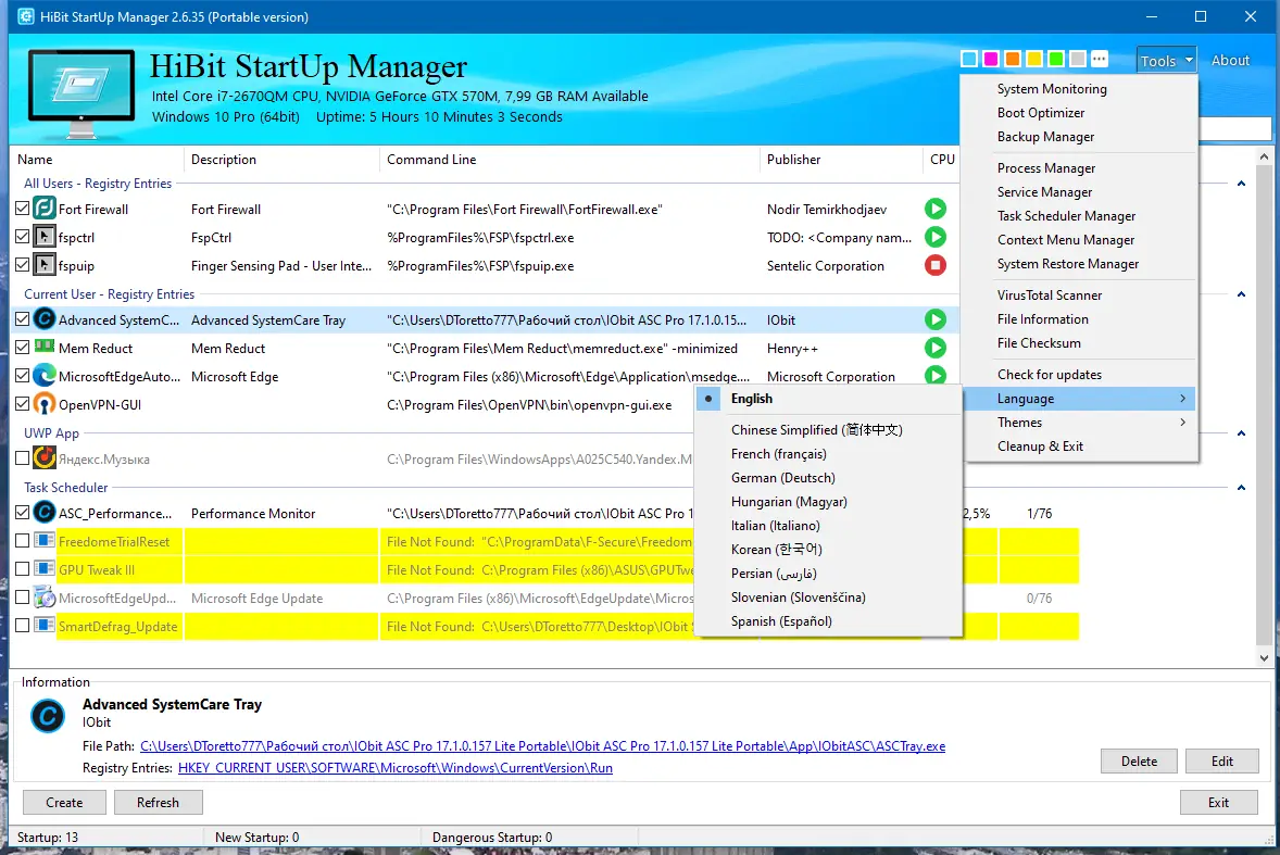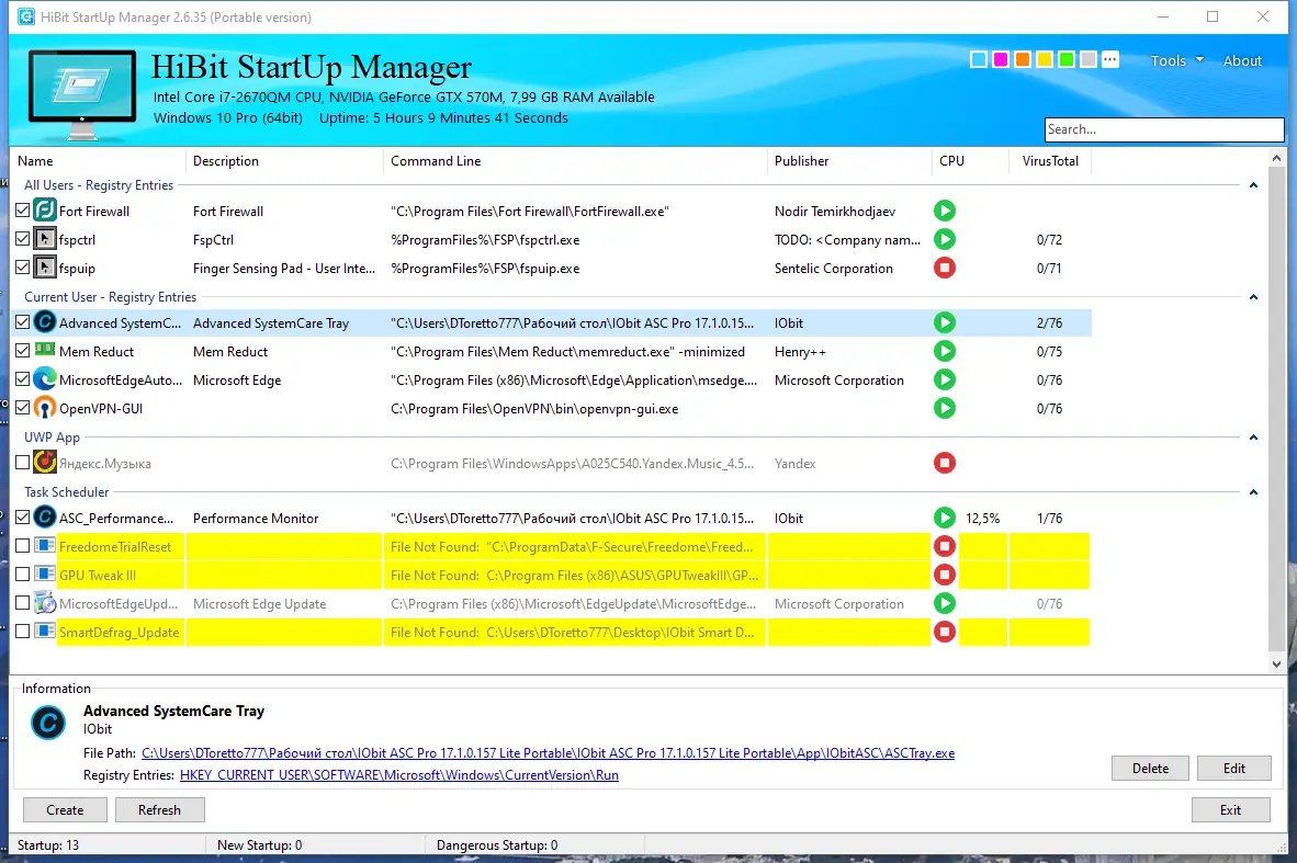 - Повышает безопасность системы, позволяя выявлять подозрительные элементы автозагрузки и проверять их через интегрированный сканер VirusTotal.