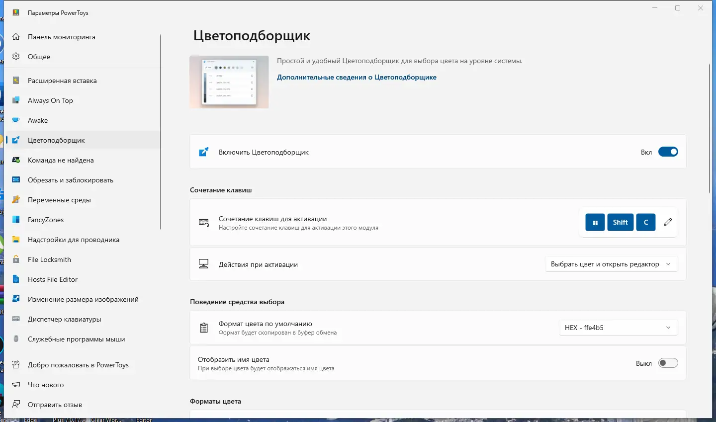 - Встроенный цветоподборщик быстро определяет цвет в форматах HEX и RGB, активируется сочетанием Win+Shift+C и незаменим при работе с графикой.