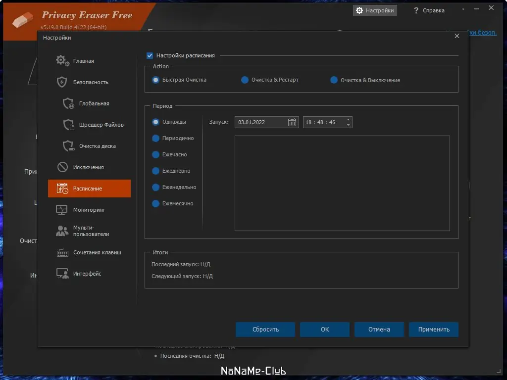 Использование Privacy Eraser не требует специальных навыков и осуществляется через интуитивно понятный интерфейс. После запуска приложения пользователь может выбрать тип очистки: полная, выборочная или с автоматическим определением активных компонентов. Доступна настройка расписания, при которой очистка выполняется в заданное время без участия пользователя. Для смены языка достаточно перейти в настройки интерфейса и выбрать русский язык из списка, после чего применить изменения. Программа также позволяет настроить действия после очистки — перезагрузку, выключение или простое завершение процесса.