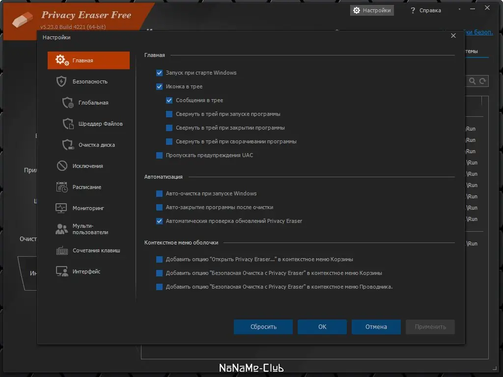 - Возможность настройки расписания очистки и выбора режима завершения: перезагрузка или выключение