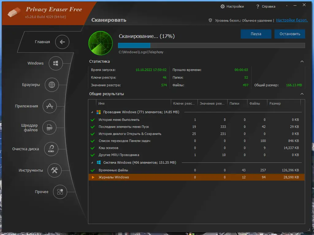 Privacy Eraser обеспечивает комплексную защиту конфиденциальной информации, стирая следы работы в операционной системе и приложениях. Программа поддерживает все основные браузеры, включая Google Chrome, Mozilla Firefox, Microsoft Edge и другие, удаляя историю поиска, автозаполнение форм, сохранённые пароли и локальные данные. Также очистка распространяется на системные журналы, буфер обмена, корзину и временные файлы, что способствует не только защите данных, но и улучшению общей производительности компьютера.