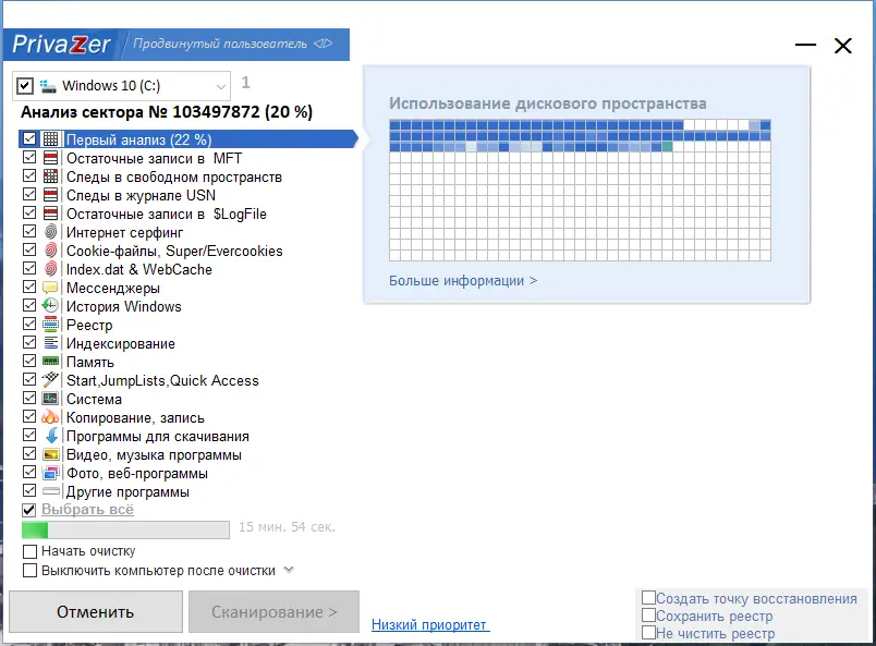 Использование программы начинается с запуска сканирования, которое можно настроить под конкретные нужды — от быстрой проверки до полного анализа всех дисков. После завершения сканирования пользователь видит структурированный список обнаруженных следов, сгруппированных по категориям: браузер, реестр, системные файлы, USB-история и другие. Каждый элемент можно изучить с помощью встроенных вьюверов, а затем выбрать для удаления. Для критически важных операций доступен шредер файлов, а также функция планирования регулярной очистки. Утилита поддерживает приоритет выполнения задач и управление индексацией, что снижает нагрузку на систему во время работы.