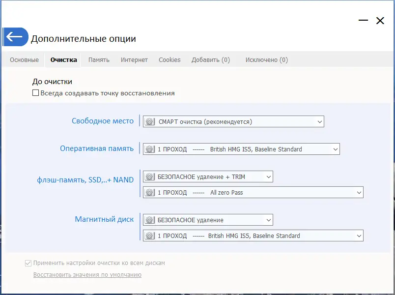 - Программа использует технологию SMART-очистки, адаптируя алгоритмы перезаписи под тип накопителя — магнитный диск или твердотельный накопитель.