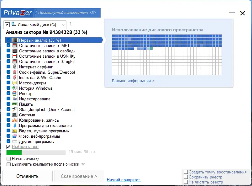 PrivaZer предлагает широкий набор инструментов для обеспечения конфиденциальности и оптимизации системы. Его возможности выходят за рамки простой очистки временных файлов, охватывая глубокую очистку и защиту от восстановления данных. Программа поддерживает многопоточную обработку и эффективно использует системные ресурсы, что позволяет ей работать быстро даже на старых компьютерах. При этом интерфейс остаётся интуитивно понятным, а логика работы — прозрачной.
