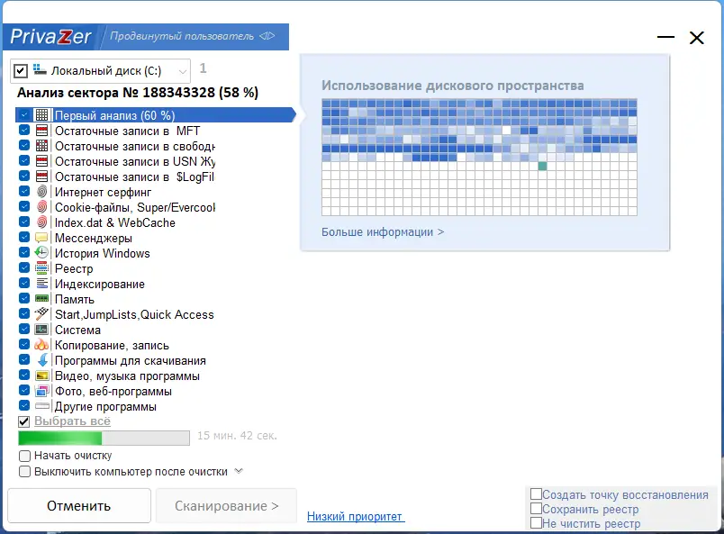 PrivaZer — это инструмент для комплексной очистки компьютера, ориентированный на защиту приватности. Он работает с различными типами данных, включая следы активности в реестре, временные файлы, кэш браузеров, а также скрытые системные области, такие как MFT, FAT, pagefile.sys и hiberfil.sys. Программа поддерживает анализ и очистку съёмных носителей, что особенно полезно при использовании общих или публичных компьютеров. Встроенные просмотровые модули позволяют детально изучить содержимое системных файлов до и после очистки. Благодаря продуманному интерфейсу и высокой скорости работы, утилита подходит как новичкам, так и продвинутым пользователям.