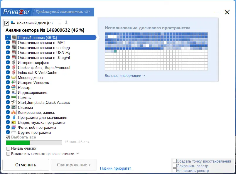 PrivaZer представляет собой инструмент для глубокой очистки и обеспечения безопасности на уровне данных. Он способен находить следы активности в самых неожиданных местах файловой системы, включая остатки файлов в свободном пространстве, записи в реестре, данные в файлах Pagefile.sys и Hiberfil.sys, а также информацию в кэше браузеров, Prefetch и Jump Lists. Программа поддерживает современные носители, адаптируя алгоритмы очистки в зависимости от типа диска — магнитного или SSD, что особенно важно для сохранения ресурса твердотельных накопителей.