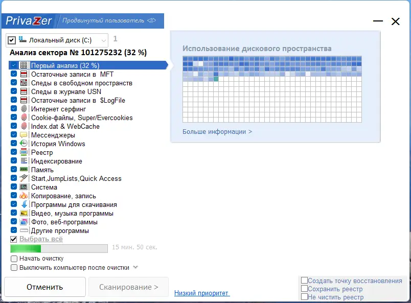 PrivaZer — это мощная утилита для глубокой очистки системы от следов пользовательской активности. Программа эффективно удаляет конфиденциальные данные, включая историю браузеров, временные файлы, записи реестра и следы подключения USB-устройств, предотвращая их восстановление.