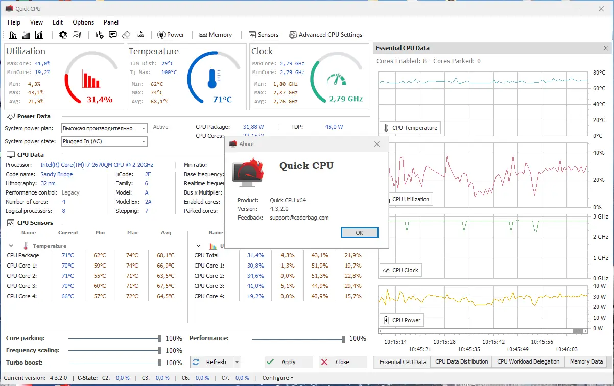 Quick CPU — это утилита для тонкой настройки параметров центрального процессора, включая управление энергопотреблением, частотами, состоянием ядер и напряжением. Программа позволяет контролировать производительность системы на аппаратном уровне, обеспечивая гибкость при работе с разными сценариями использования, от энергосбережения до максимальной отдачи. Поддерживает мониторинг в реальном времени и вносит изменения без необходимости перезагрузки, что делает её удобной для опытных пользователей. Особое внимание уделено инструментам для процессоров Intel, включая современные функции вроде Speed Shift и FIVR. Работа с такими параметрами требует осторожности, поскольку неправильные настройки могут привести к нестабильности системы.