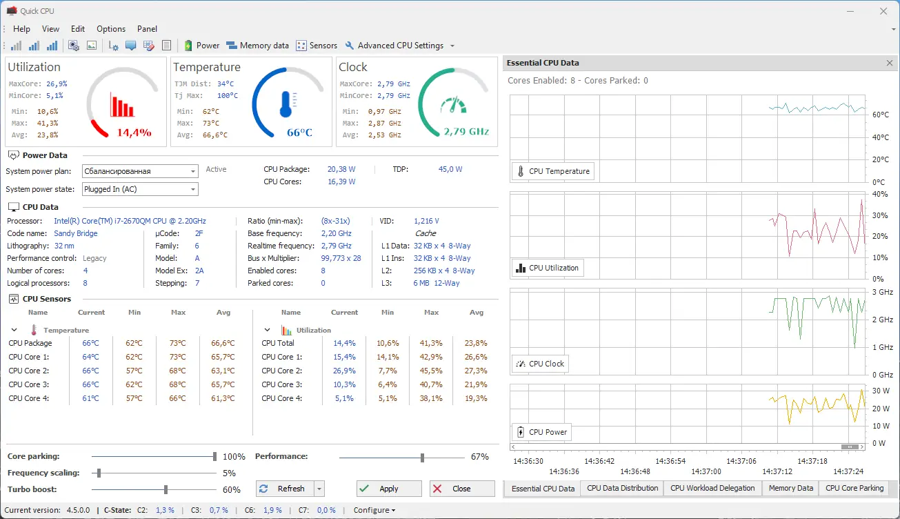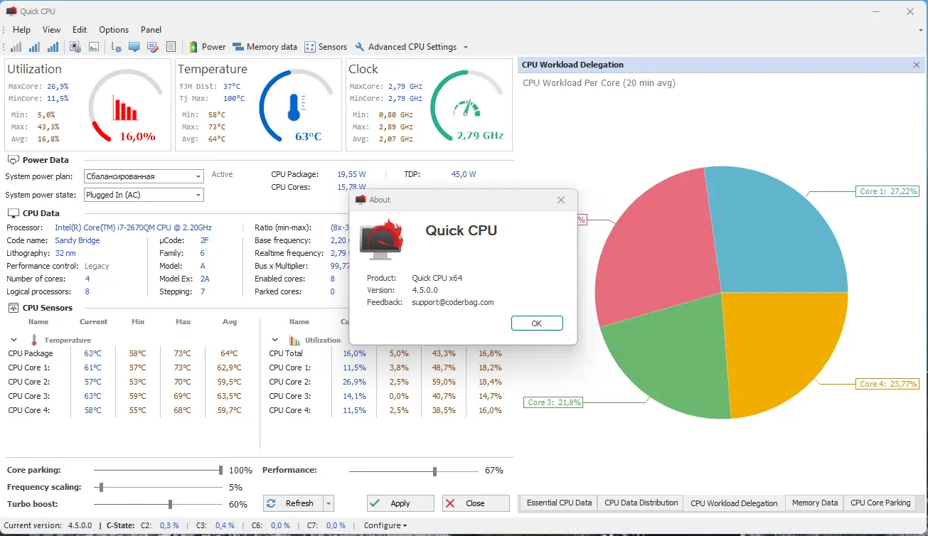Quick CPU — это инструмент, предназначенный для тонкой настройки процессора и системы энергосбережения в операционной системе Windows. Утилита позволяет контролировать такие параметры, как парковка ядер, масштабирование производительности, состояния C-State, технологию Turbo Boost и управление напряжением через FIVR. Программа ориентирована на пользователей, которым важно получить максимальную отдачу от аппаратного обеспечения за счёт ручной оптимизации.