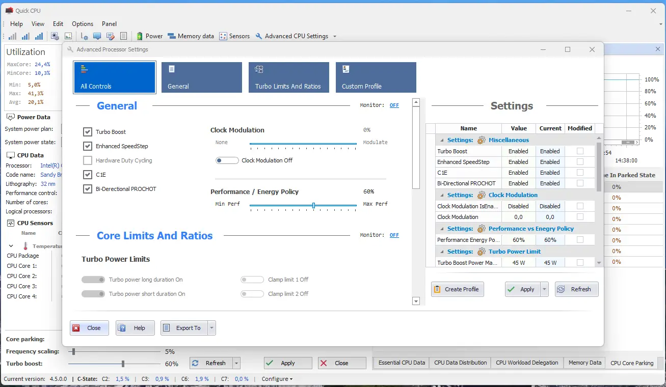 Quick CPU — утилита для детальной настройки параметров центрального процессора, включая управление энергопотреблением, частотами, состояниями ядер и напряжением. Программа подходит для продвинутых пользователей, стремящихся оптимизировать производительность системы без необходимости перезагрузки. Она предоставляет доступ к глубоким настройкам, обычно скрытым в BIOS или недоступным в стандартных средствах Windows.