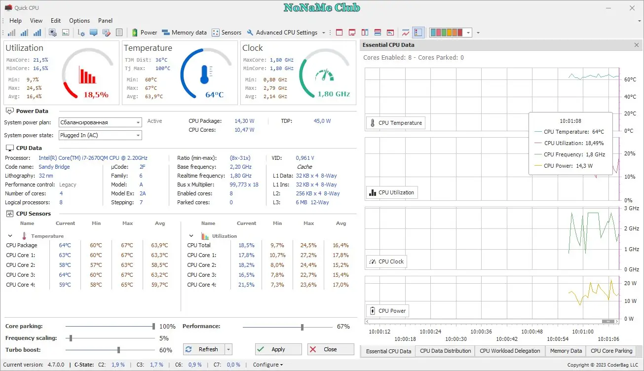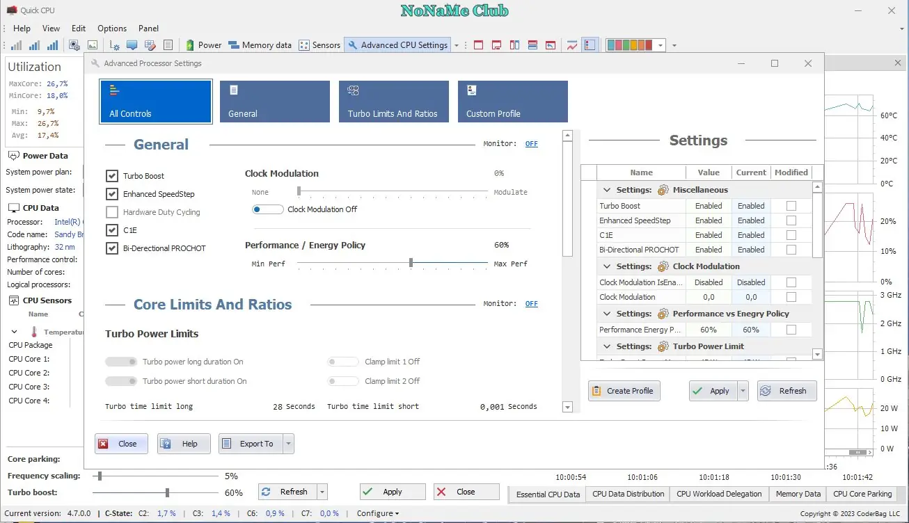 Quick CPU представляет собой инструмент для детального контроля над процессором и его энергетическими режимами. Утилита разработана для пользователей, которым важно точно настраивать поведение CPU под определённые задачи, будь то повышение отзывчивости системы или продление времени автономной работы. Программа работает с аппаратными возможностями современных процессоров, включая интеллектуальное масштабирование частот и управление состояниями простоя. Она поддерживает как настольные, так и мобильные платформы с архитектурой x64, что делает её универсальным решением для широкого круга устройств.