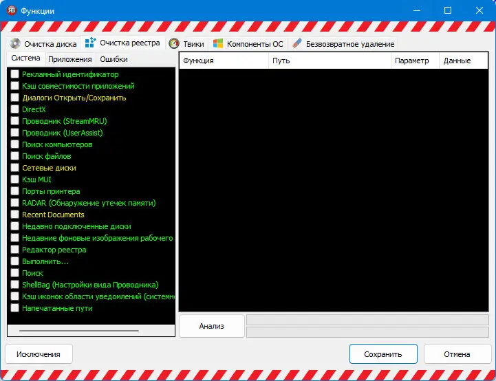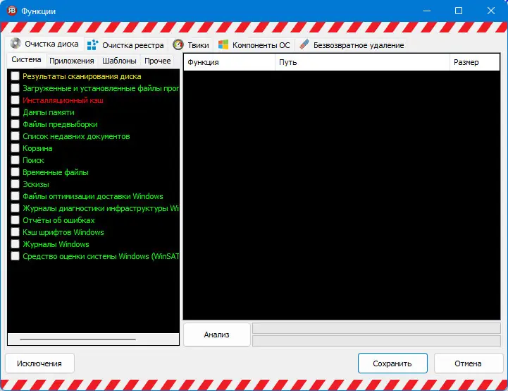- Программа позволяет удалить следы активности в браузерах, включая кэш, cookies и историю посещений, обеспечивая конфиденциальность пользователя.