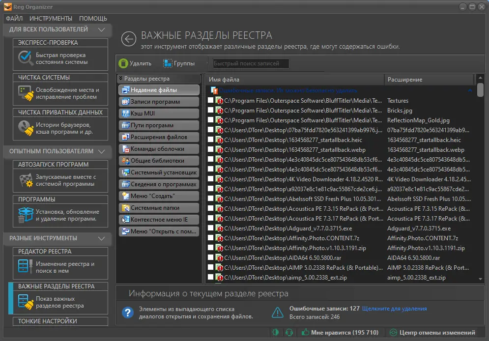 - Проводит глубокую очистку реестра от устаревших и неверных записей.