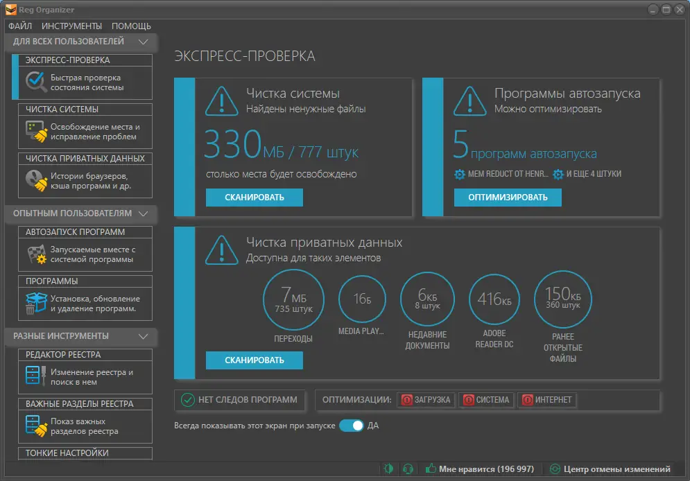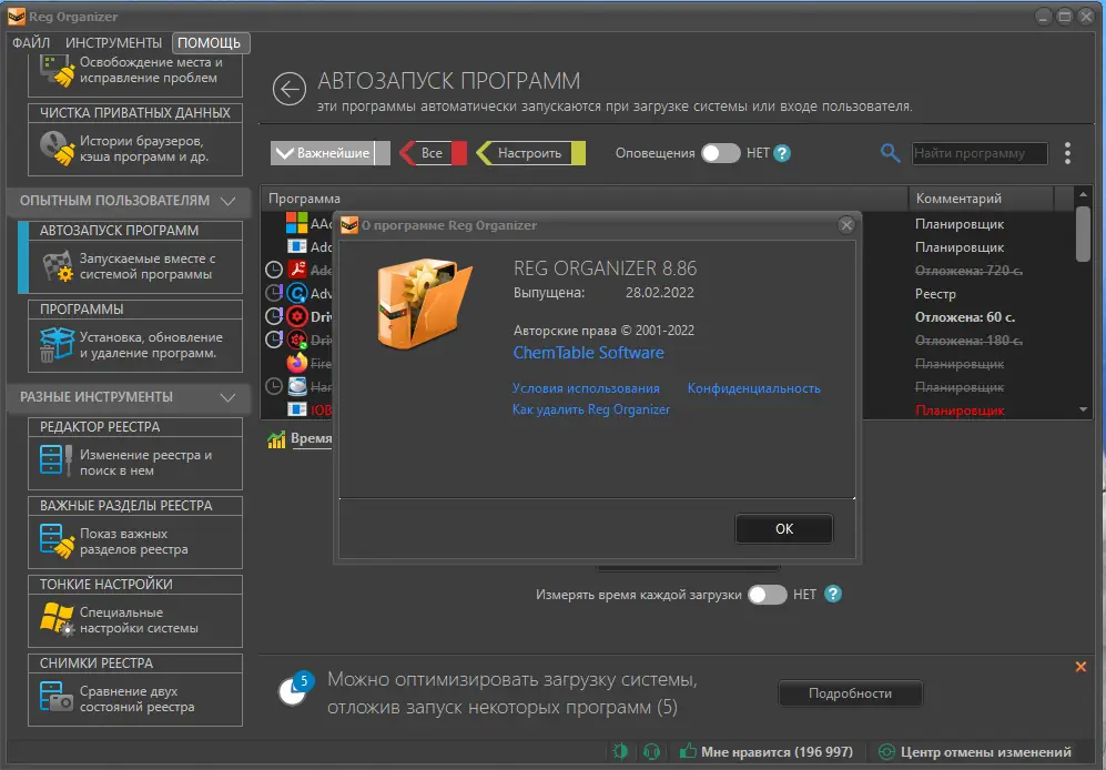 Reg Organizer — это многофункциональный инструмент для обслуживания системного реестра Windows, сочетающий в себе функции очистки, редактирования, дефрагментации и удаления программ с полной очисткой следов. Программа помогает оптимизировать работу операционной системы, устраняя ошибки, накопленные в реестре, и освобождая дисковое пространство. Её интерфейс интуитивно понятен, а набор встроенных утилит охватывает широкий спектр задач по поддержке и настройке системы.