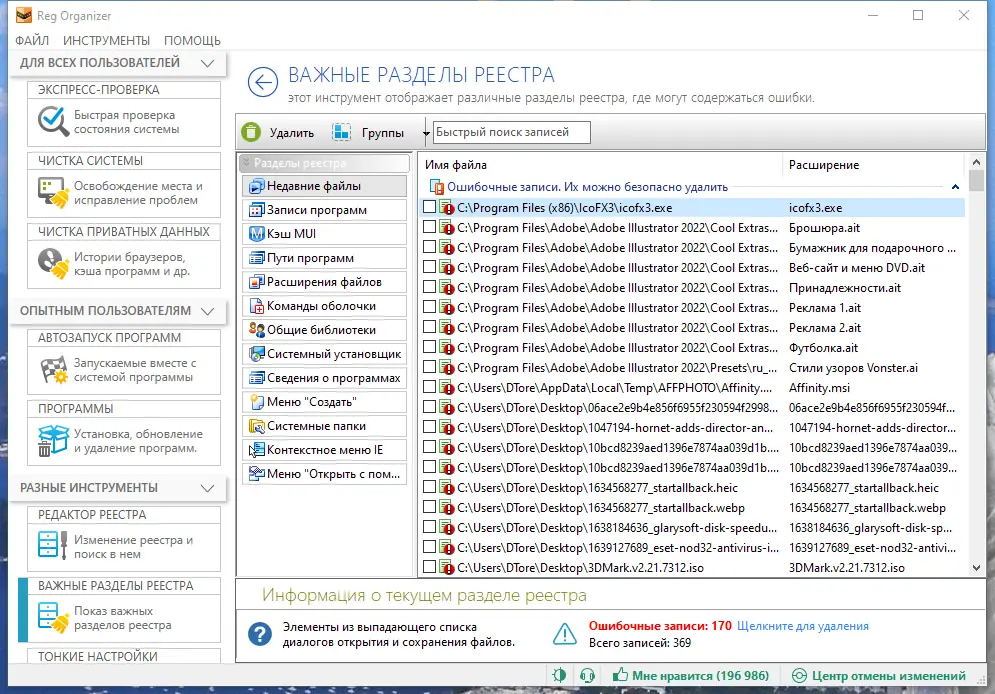 - Осуществляет глубокую очистку реестра от устаревших, повреждённых и лишних записей, предотвращая сбои и замедление работы системы.