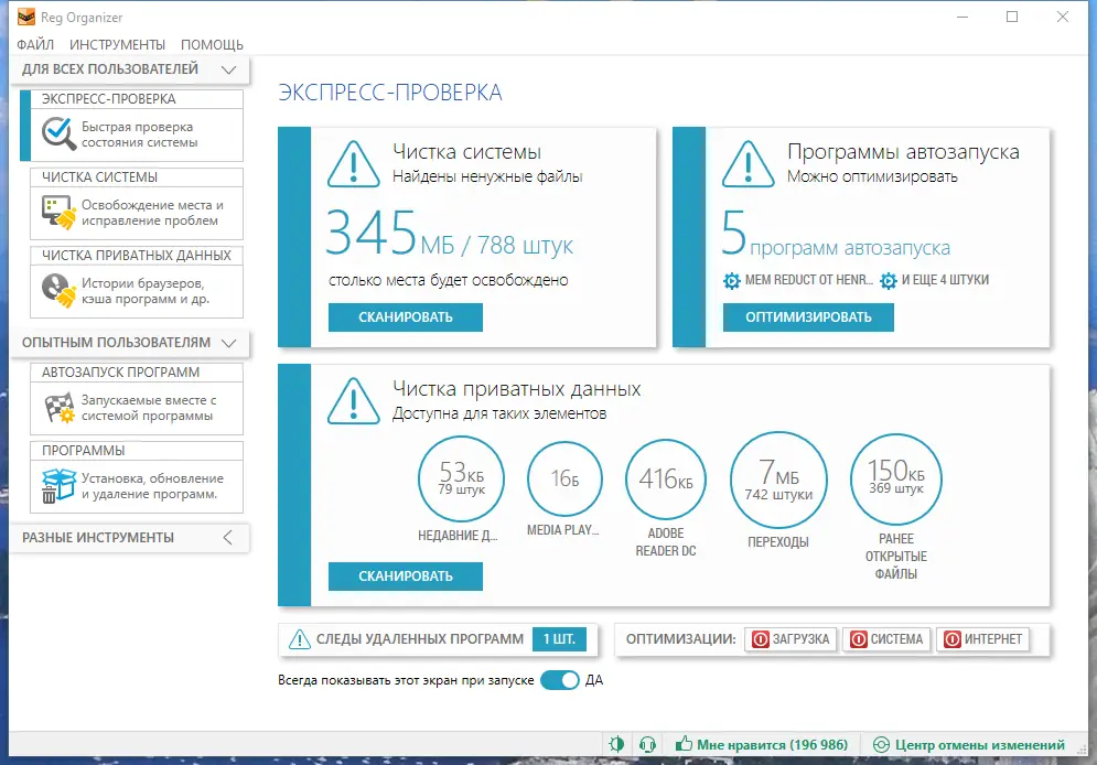 Программа эффективно справляется с оптимизацией системы за счёт комплексного подхода к обслуживанию реестра и управления установленным ПО.