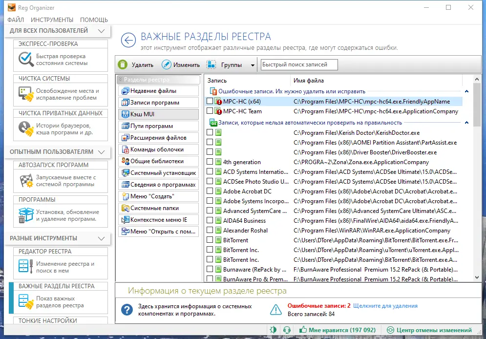 - Позволяет проводить чистку, сжатие и дефрагментацию реестра для повышения стабильности системы.