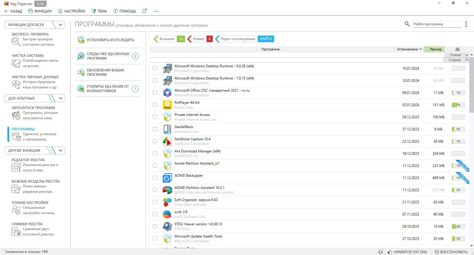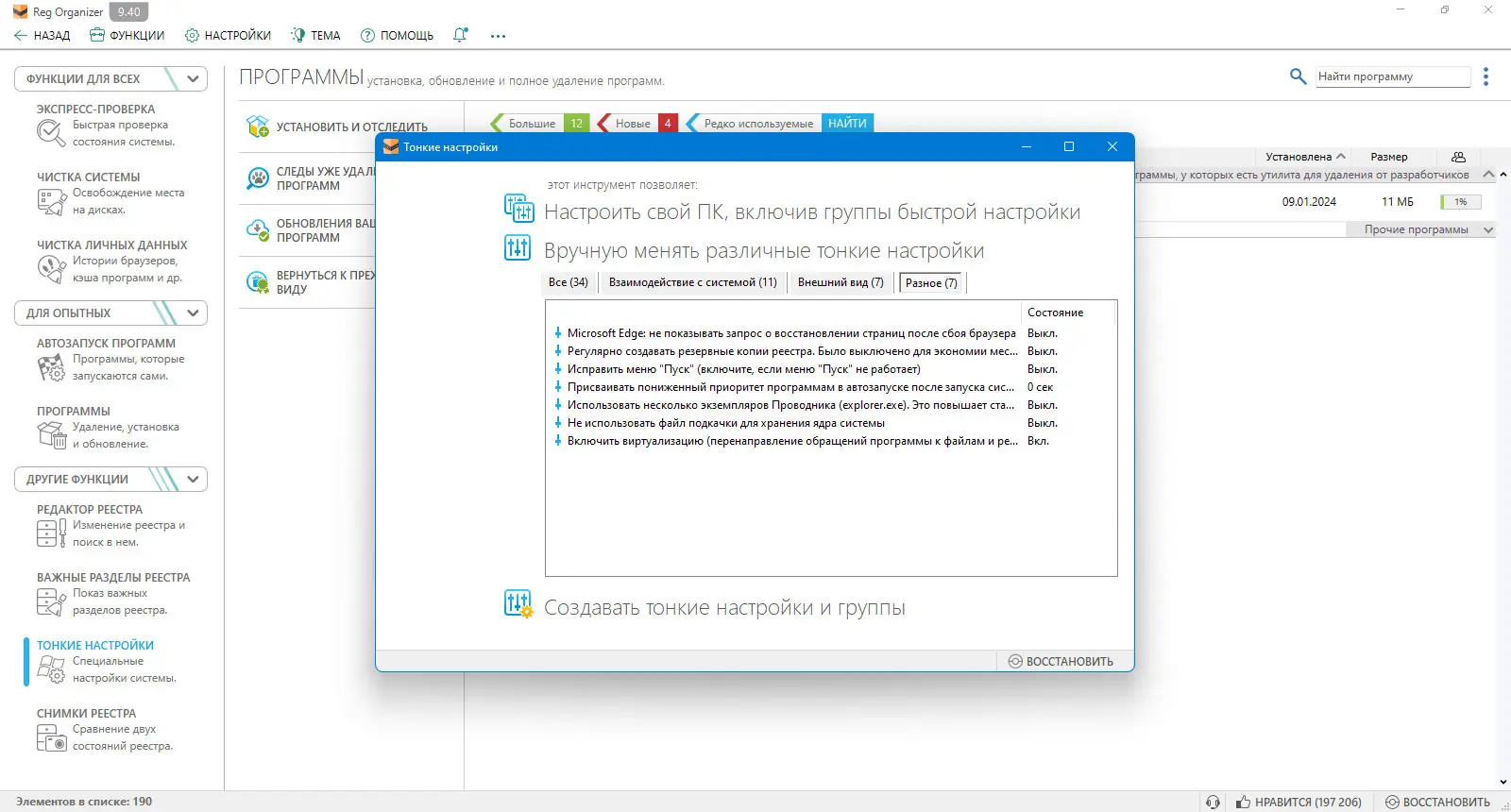 Reg Organizer — это многофункциональный твикер, предназначенный для глубокой оптимизации операционной системы через управление реестром. Программа обеспечивает стабильную работу системы за счёт устранения ошибок, мусорных записей и избыточных данных. Она поддерживает все актуальные версии Windows, включая 32- и 64-битные сборки, и предлагает интуитивно понятный интерфейс, упрощающий сложные операции.