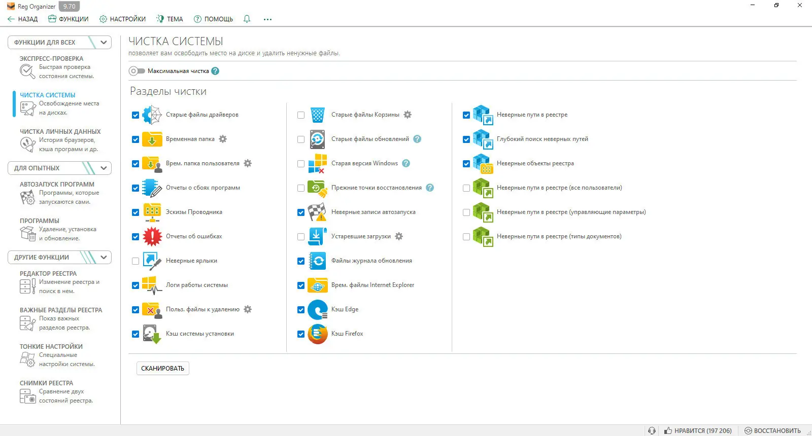- Проводит глубокую очистку реестра от мусора и ошибок