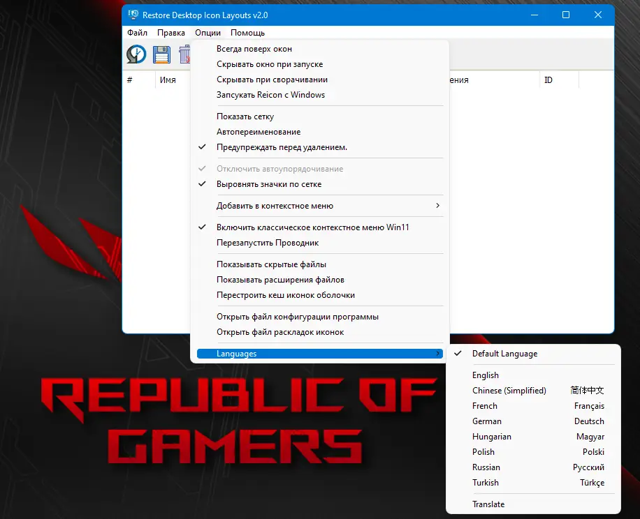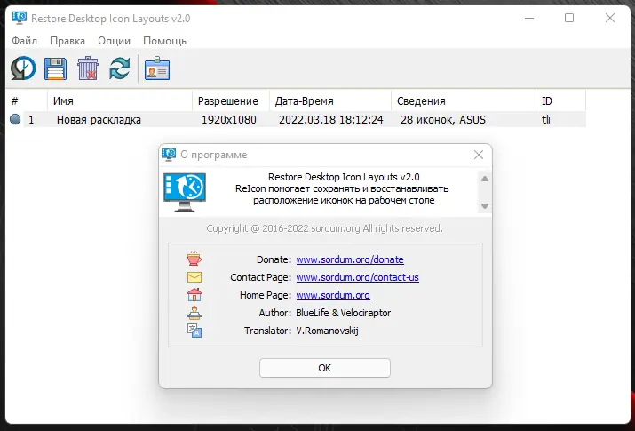 ReIcon — это легковесное приложение для сохранения и восстановления макета иконок на рабочем столе, особенно полезное при частой смене разрешения экрана. Программа помогает вернуть значки в изначальное положение после запуска игр или приложений, изменяющих настройки дисплея, всего за один клик.