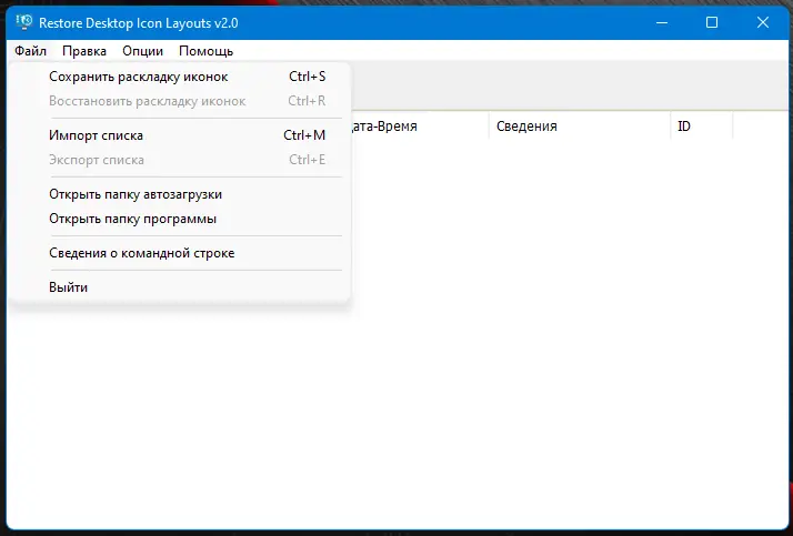 Использование программы не требует специальных знаний. После запуска ReIcon можно сохранить текущее расположение иконок, выбрав соответствующую команду в контекстном меню или через интерфейс. При изменении разрешения экрана и последующем возврате к исходному, достаточно вызвать меню программы и выбрать нужный макет для восстановления. В версии 2.0 появилась возможность обновлять ранее сохранённые макеты, не создавая новых записей, что упрощает управление конфигурациями. Также увеличено количество пунктов восстановления в контекстном меню — теперь можно добавить до шести вариантов, настраиваемых через ini-файл. Дополнительные параметры в меню «Параметры» позволяют гибко настроить поведение программы под индивидуальные предпочтения.