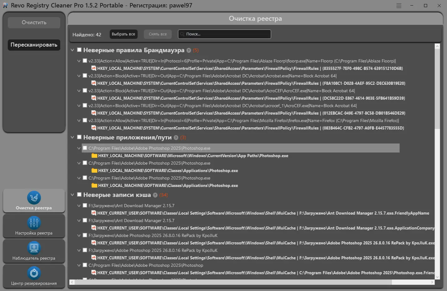 - Глубокое сканирование всех ветвей реестра с фильтрацией по типам ошибок