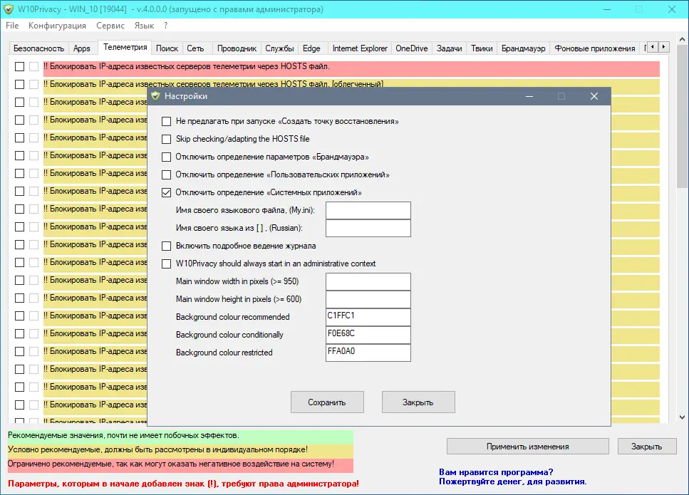 Каждый параметр в W10Privacy помечен цветом: зеленый — безопасно, желтый — может повлиять на функциональность, красный — высокий риск изменения стабильности системы.
