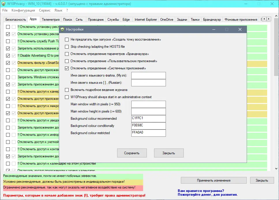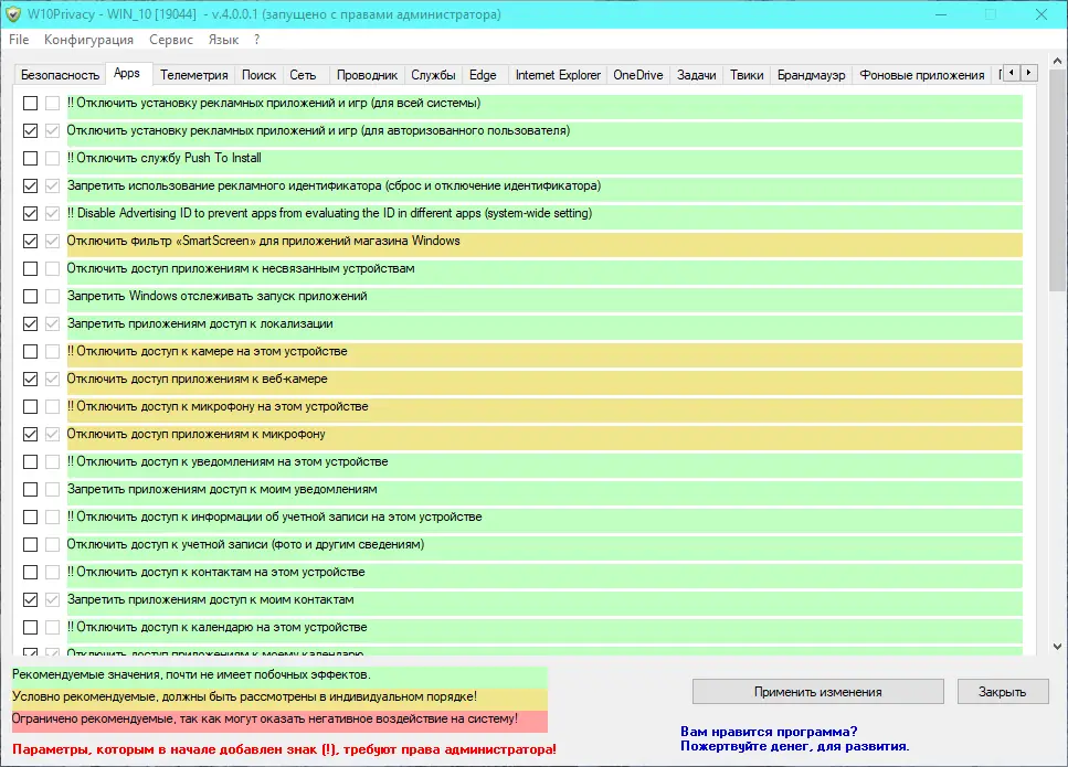 W10Privacy не вмешивается в систему автоматически — все изменения вносятся только по решению пользователя.