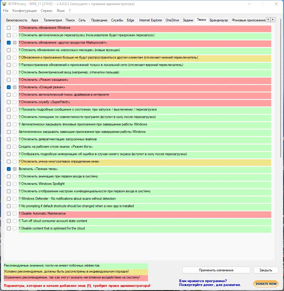 Пользоваться программой просто: после запуска пользователь видит список категорий с чекбоксами напротив каждого параметра. Для применения изменений достаточно отметить нужные пункты и нажать кнопку «Apply». Программа мгновенно вносит правки в реестр и системные политики, не требуя перезагрузки в большинстве случаев. При необходимости можно откатить изменения, вручную сняв галочки и применив новую конфигурацию. Важно помнить, что W10Privacy не создаёт точку восстановления автоматически, поэтому перед внесением масштабных изменений рекомендуется создать её вручную через системные инструменты Windows.