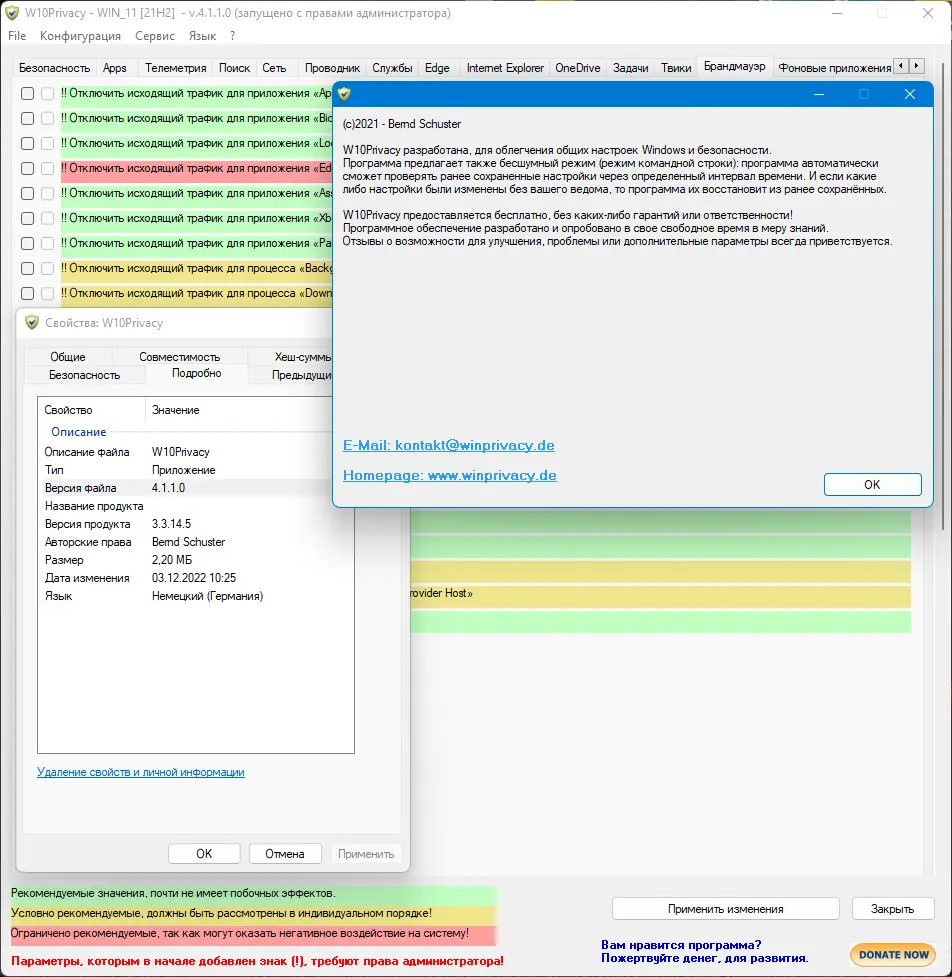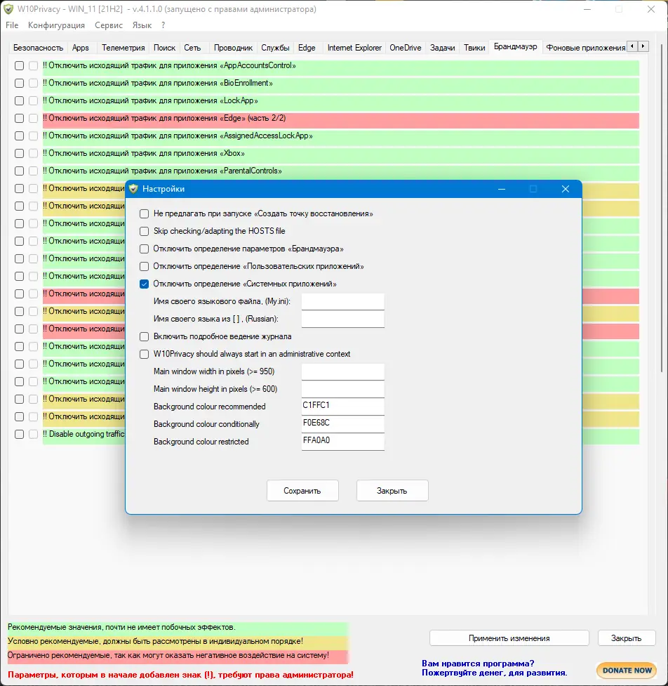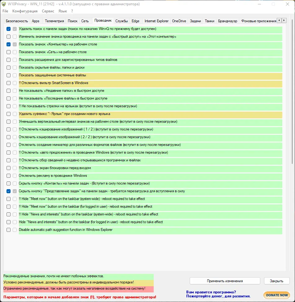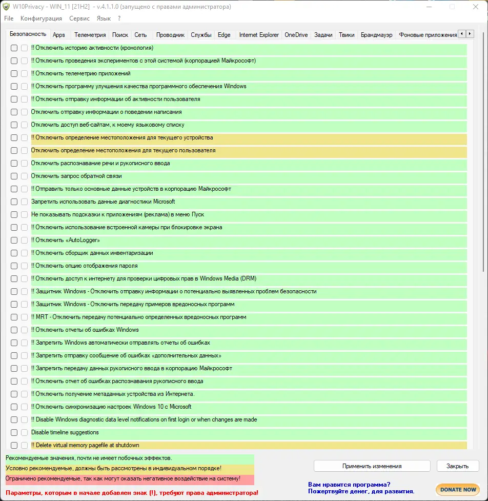 Каждый параметр в W10Privacy помечен цветом: зелёный — безопасно, жёлтый — требует внимания, красный — может повлиять на стабильность системы.