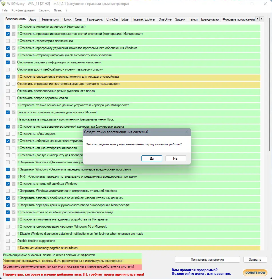 Перед внесением изменений рекомендуется создать точку восстановления вручную, так как сама утилита не делает этого автоматически.