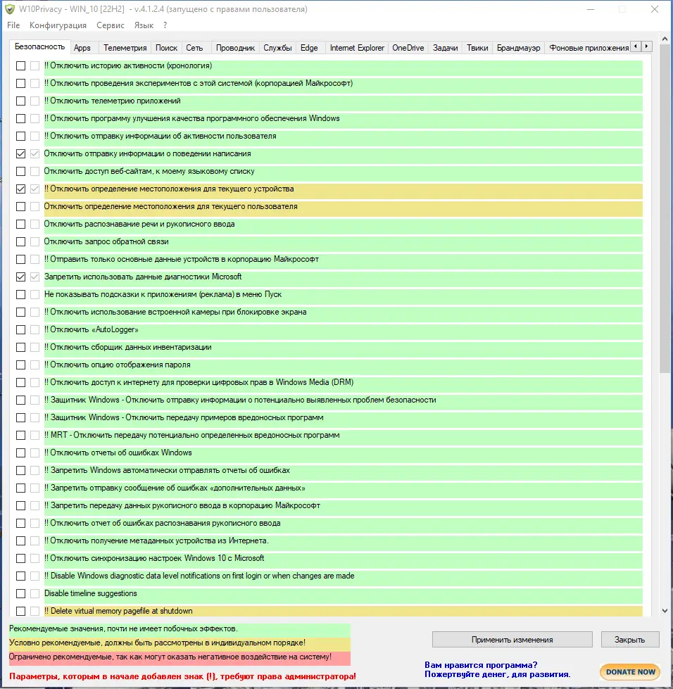 - Программа отключает телеметрию и сбор диагностических данных со стороны Microsoft