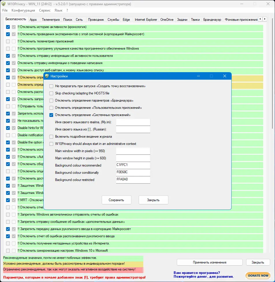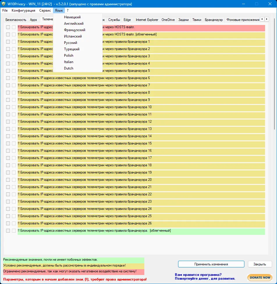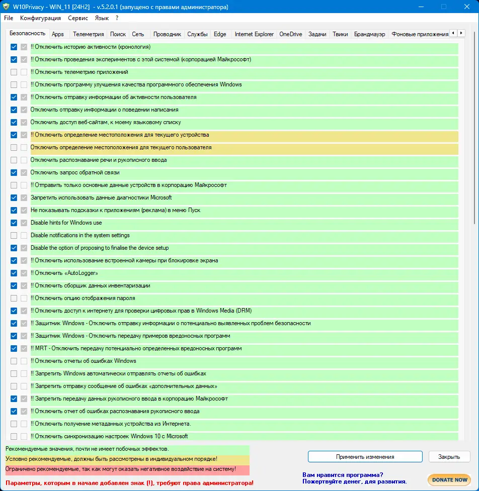 - Программа охватывает двенадцать категорий настроек, включая телеметрию, рекламные идентификаторы, службы диагностики и автоматические обновления.