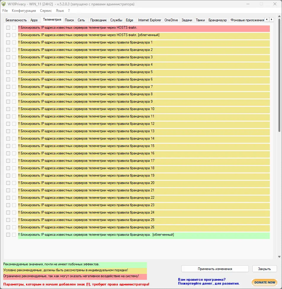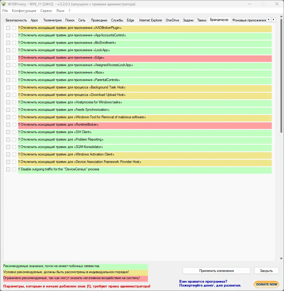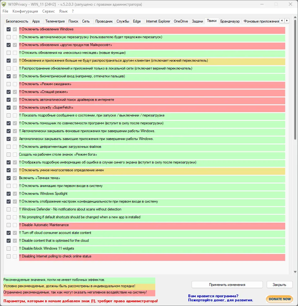 Программа сочетает в себе высокую функциональность и простоту интерфейса, что делает её полезной как для опытных пользователей, так и для новичков, стремящихся повысить уровень своей цифровой безопасности. Благодаря чёткой структуре и визуальной индикации рисков, можно быстро адаптировать систему под личные предпочтения по приватности. При этом отсутствие автоматического резервного копирования требует дополнительной осторожности.
