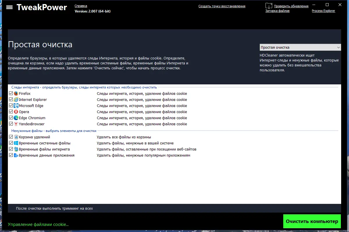 - Очистка мусора, следов посещения интернет-страниц и ошибок реестра для повышения стабильности системы.