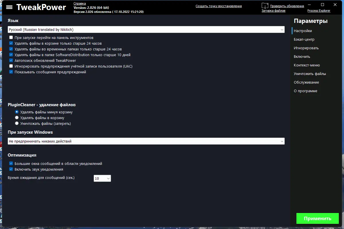 - Комплексный подход к настройке и оптимизации Windows с возможностью тонкой регулировки сотен параметров.