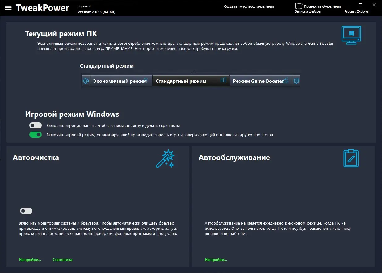 TweakPower представляет собой многофункциональный твикер, предназначенный для глубокой настройки и ускорения работы Windows. Он позволяет пользователям гибко управлять параметрами операционной системы, не требуя специальных знаний. Интерфейс программы организован в виде централизованной панели, где все инструменты сгруппированы по категориям. Это упрощает навигацию и позволяет быстро находить нужные функции. Программа поддерживает как автоматические, так и ручные режимы оптимизации, что даёт полный контроль над процессами настройки.