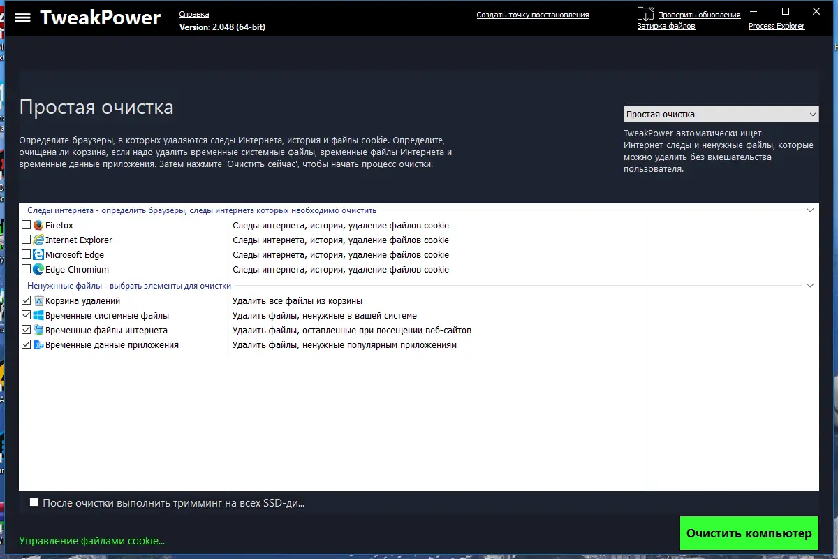 - Осуществляет комплексную очистку системы от временных файлов, кеша браузеров и следов активности в интернете.
