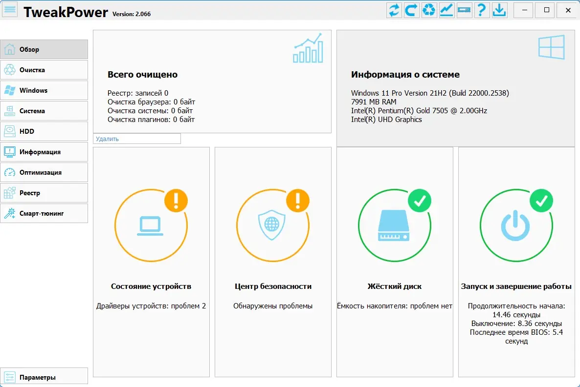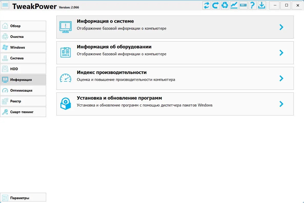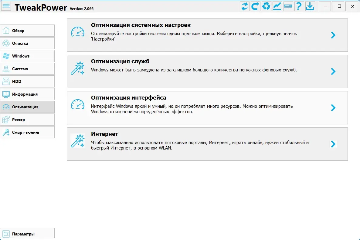 TweakPower — это комплексный инструмент для тонкой настройки, диагностики и оптимизации операционной системы Windows. Программа объединяет множество функций в одном интерфейсе, позволяя улучшить производительность, стабильность и безопасность компьютера. Благодаря широкому набору модулей, TweakPower подходит как для опытных пользователей, так и для тех, кто впервые занимается обслуживанием системы.