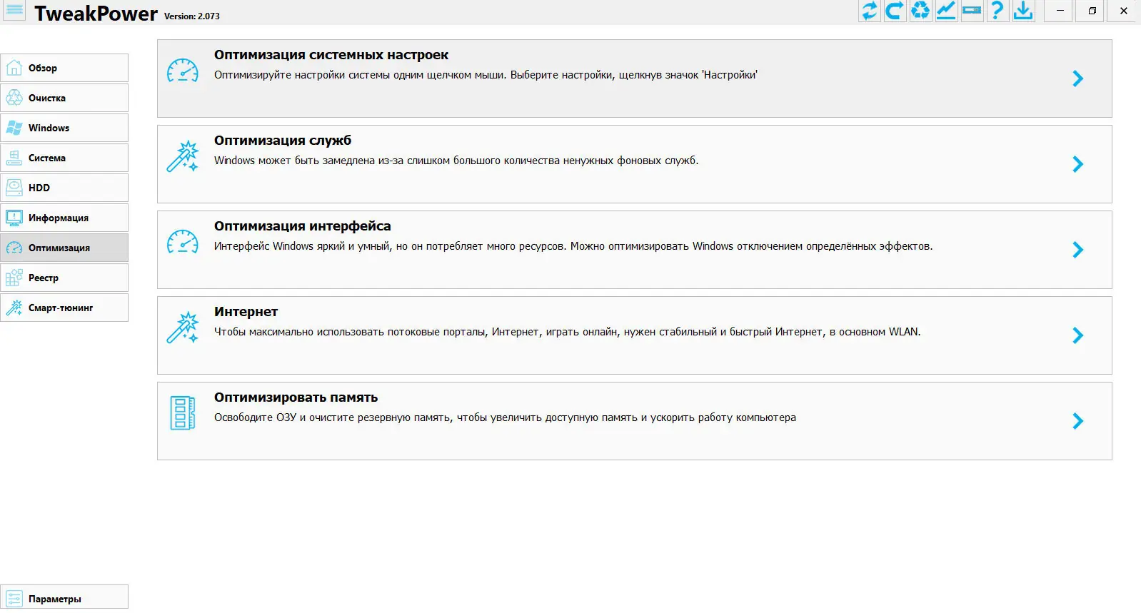 TweakPower — это универсальный инструмент для тонкой настройки и улучшения производительности компьютера. Программа предназначена для пользователей, желающих получить полный контроль над системой, не прибегая к ручному редактированию реестра или настройке через встроенные средства Windows. Её интерфейс организован так, чтобы даже начинающий пользователь мог быстро разобраться в функциях и настройках.